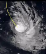 On April 23, the FMS started to monitor a depression that had developed within the South Pacific Convergence Zone, between Tokelau and the Cook Islands and was slowly deepening under the influence of a strong upper-level ridge of high pressure.[1][52] The system subsequently moved westwards and was over the western part of Tokelau by April 25, before it started to accelerate westwards under the influence of an intensifying anticyclone that was located near New Zealand.[52] Over the next couple of days the depression moved westwards and passed over southern Tuvalu during April 27, before the system slowed down while it was located about 555 km (345 mi) to the east of the Solomon Island: Anuta.[52][53] During April 28, the JTWC and FMS reported that the system had developed into a tropical cyclone, with the latter naming it as Innis.[13][52] After it had been named Innis continued to intensify further and acquired a symmetrical cloud signature during March 29, before the JTWC reported that the system had peaked with 1-minute maximum sustained windspeeds of 120 km/h (75 mph).[52][53]