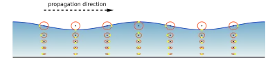 Underneath the surface, there is a fluid motion associated with the free surface motion. While the surface elevation shows a propagating wave, the fluid particles are in an orbital motion. Within the framework of Airy wave theory, the orbits are closed curves: circles in deep water and ellipses in finite depth—with the circles dying out before reaching the bottom of the fluid layer, and the ellipses becoming flatter near the bottom of the fluid layer. So while the wave propagates, the fluid particles just orbit (oscillate) around their average position. With the propagating wave motion, the fluid particles transfer energy in the wave propagation direction, without having a mean velocity. The diameter of the orbits reduces with depth below the free surface. In deep water, the orbit's diameter is reduced to 4% of its free-surface value at a depth of half a wavelength.