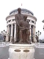 The Art Bridge (Macedonian: Мост на уметноста, romanized: Most na umetnosta, pronounced [mɔst na uˈmɛtnɔsta]) is a pedestrian bridge across the Vardar River in the centre of Skopje, the capital city of North Macedonia. The bridge features many statues of noted Macedonian artists and musicians. It was built as part of the larger Skopje 2014 project, with an estimated construction cost of €2.5 million. The bridge includes 29 sculptures, with 14 at each side and one in the centre. It is 83 metres (272 ft) in length and 9.2 metres (30 ft) in width, while the central part of the bridge is 12 metres (39 ft) wide.[1]