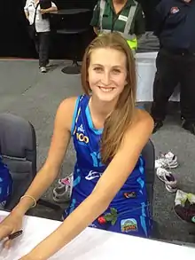 On 3 June 2015, Ernst signed with the Perth Lynx for the 2015–16 WNBL season.[7] She helped lead the Lynx to a second place regular season finish with a 16–8 win–loss record, and went on to score 17 points in the team's semi-final win over the first-seeded Townsville Fire.[8] With the win, the Lynx advanced to the WNBL grand final for the first time since 1999.[9] There they were outclassed by the defending champion Townsville (who made it to the grand final via the preliminary final), losing the best-of-three series 2–0. She appeared in all 27 games for the Lynx in 2015–16, averaging 11.6 points and 3.6 rebounds per game. She remained in Perth during the 2016 off-season and joined the Kalamunda Eastern Suns of the State Basketball League.[10][11]