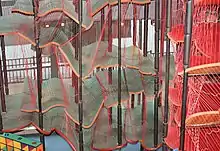 Although it would be several more years before the museum would relocate to Holyoke Heritage Park, the pilot proved to be a success and in the following year the museum moved to its first permanent home, 15 Papineau Street, at the old Springdale School.[3] In its early years the museum would try several different exhibits, in part designed to foster empathy toward the disabled. Among these was a 1983 temporary exhibit introducing children to disability studies with activities such as having children attempt to tie their shoes wearing oversized gloves, riding different wheelchairs, attempting to read in braille, and completing various puzzles while blindfolded.[4] Other examples included an animal exhibit introducing children to hamsters, rabbits, and other pets loaned to the museum by a local pet store, "Fins, Feathers and Furs", as well as demonstration of the work and training of seeing-eye and hearing dogs.[5] In its first several years the museum would also incorporate exhibits celebrating different cultures, including events such as demonstrations of cooking Indian food, and Irish dancing.[6][7]