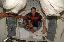 - EV2 during second spacewalk which included first part of rewiring the power system of the ISS specifically channel 2 and 3. Also performed together with Astronaut Robert Curbeam as EV1, 14 December.[9]