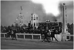 Count Fleet followed this up with a six-length win in the Thunderclap Purse on October 20 at odds of 1–4.[16] On October 31, he again faced off with Occupation in the Pimlico Futurity in what essentially became a match race. Occupation took the early lead but Count Fleet moved up on the outside and the two matched strides down the backstretch and into the final turn. Rounding into the stretch, Count Fleet started to draw away and eventually won by six lengths. His time of 1:433⁄5 for 1+1⁄16 miles equaled the track record and broke the existing stakes record by over a second.[17]
