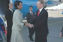 Craig A. Kelly greets Condoleezza Rice upon arrival in Santiago International Airport, April 28, 2005
