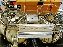A "Saturation System" or "Saturation spread" typically includes a living chamber, transfer chamber and submersible decompression chamber, which is commonly referred to in commercial diving and military diving as the diving bell,[57] PTC (Personnel Transfer Capsule) or SDC (Submersible Decompression Chamber).[58] The system can be permanently installed on a ship or ocean platform, but is more commonly capable of being dismantled and moved from one vessel to another by crane. The entire system is managed from a control room, commonly referred to as the "van", where depth, chamber atmosphere and other system parameters are monitored and controlled. The diving bell is the elevator or lift that transfers divers from the system to the work site. Typically, it is mated to the system utilizing a removable clamp and is separated from the system tankage bulkhead by a trunking space, a kind of short tunnel, through which the divers transfer to and from the bell. At the completion of work or a mission, the saturation diving team is decompressed gradually back to atmospheric pressure by the slow venting of system pressure, at rates of about of 15 to 30 msw (50 to 100 fsw) per day, (schedules vary). Thus the process involves only one ascent, thereby mitigating the time-consuming and comparatively risky process of multiple decompressions normally associated with non-saturation ("bounce diving") operations.[59] The chamber gas mixture is typically controlled to maintain a nominally constant partial pressure of oxygen of between 0.3 and 0.5 bar during most of the decompression (0.44 to 0.48 bar on US Navy schedule), which is below the upper limit for long term exposure.[60] NOAA has used rather different saturation decompression schedules for relatively shallow (less than 100 fsw) air and nitrox saturation dives, which use oxygen breathing when pressure is reduced to less than 55 fsw.[61]