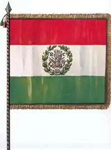 During the Napoleonic era, in 1797, the first official adoption of the Italian tricolour as a national flag by a sovereign Italian state, the Cispadane Republic, a Napoleonic sister republic of Revolutionary France, took place, on the basis of the events following the French Revolution (1789–1799) which, among its ideals, advocated the national self-determination.[105][106] This event is celebrated by the Tricolour Day.[107] The Italian national colours appeared for the first time on a tricolour cockade in 1789,[108] anticipating by seven years the first green, white and red Italian military war flag, which was adopted by the Lombard Legion in 1796.[109]