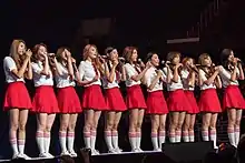 Dance is an integral part of K-pop. When combining multiple singers, the singers often switch their positions while singing and dancing by making prompt movements in synchrony, a strategy called "formation changing" (자리바꿈; jaribakkum).[47] The K-pop choreography (안무; 按舞; anmu) often includes the so-called "point dance" (포인트 안무; pointeu anmu), referring to a dance made up of hooking and repetitive movements within the choreography that matches the characteristics of the lyrics of the song.[48][49] Super Junior's "Sorry Sorry" and Brown Eyed Girls' "Abracadabra" are examples of songs with notable "point" choreography. To choreograph a dance for a song requires the writers to take the tempo into account.[50] According to Ellen Kim, a Los Angeles dancer and choreographer, a fan's ability to do the same steps must also be considered. Consequently, K-pop choreographers have to simplify movements.[50]