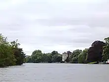 The weir stretches a long way upstream above the lock.