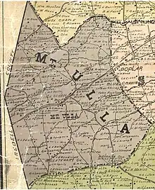 The Mount Ulla Township is a legislatively defunct administrative subdivision for voting precincts, tax-listings, and census districts thus does not coincide or reflect local inhabitants historical perception of Mount Ulla boundaries.[3][4] It consists of several unincorporated communities such as Mount Ulla and part of Bear Poplar. Mount Ulla Township was formed after the Civil War by the requirements of the North Carolina Constitution of 1868. Previous to that time, the subdivisions were Captain's Districts from the time of the American Revolution. While the Captain's Districts referred primarily to the militia, it served also for the election precinct, the tax listing and tax collecting district.[5][6] Mount Ulla Township was mentioned on Shaffer's Township map of North Carolina in 1886.[7]