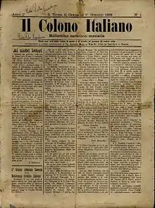 Il Colono Italiano will be the friend, the counselor, the guide, the lawyer of the Italian Catholics immigrating to Caxias do Sul and the surrounding colonies. It will provide them with interesting news from dear and beautiful Italy. For this purpose it is pleased to announce that it has a distinguished correspondent in Rome and that it will find others in the main Italian cities. Il Colono Italiano will not be concerned with politics, since there is in the city O Caxiense - to which we send a fraternal greeting. Without being involved in politics, Il Colono Italiano will not cease to recommend to its readers obedience to the laws and to the authorities legitimately constituted. It will give an overview of the development of Catholic Societies, their festivals and actions, so that they may serve as an example of fervent encouragement to cowards and indifferent people. It will publish novels, stories and novels that are entertaining and honest.[7]