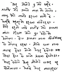 The native script of the language is called the Sirmauri script.[4] This script is under proposal to be encoded in Unicode.[5] It is locally known as Dhankari. Pabuuchi was a script used by a class of astrologers.