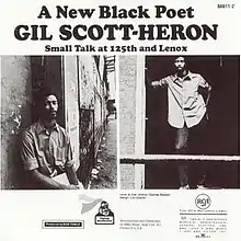 A New Black Poet - Small Talk at 125th and Lenox, also known simply as Small Talk at 125th and Lenox,[5] is a live album and the first release of recording artist Gil Scott-Heron, released in 1970 on Flying Dutchman Records.[6] Recording sessions for the album were originally said to have taken place live at a New York nightclub located on the corner of 125th Street and Lenox Avenue,[5] but liner notes included in the 2012 box set The Revolution Begins: The Flying Dutchman Masters, Scott-Heron himself insists that a small audience was brought to 'the studio' and seated on 'folding chairs'.[7] By the time of the recordings, Scott-Heron had published a volume of poetry and his first novel, The Vulture.[8] Well received by music critics who found Scott-Heron's material imaginative,[2][3] Small Talk at 125th and Lenox has been described as "a volcanic upheaval of intellectualism and social critique" by AllMusic editor John Bush.[1]