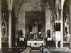A census taken in 1904 counted 42 German families, mostly farmers, 56 Irish families, mostly railroad workers, and 8 French families. In 1904 a new, white-oak main altar with ornate reredos was constructed, along with an additional two side altars of white walnut dedicated to St. Joseph and St. Anthony (right). The side altars of the Sacred Heart and the Blessed Mother were original to the church and also made of white walnut. By 1907 the parish census counted 738 people. The Catholic influence in the Chillicothe area was evidenced by the Franciscan's Historical Sketches of the parish (1905), which contained over 100 advertisements of one-quarter page or more.[2]