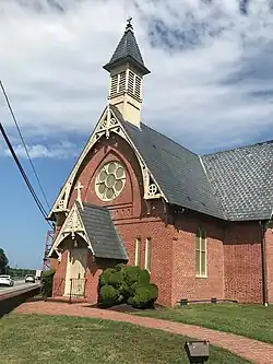 The church building is made of brick and uses portions of the 1820s church exterior walls.[2] The most noticeable exterior features are the steep slate roofs; large rose windows in the east, north, and west gables; a Victorian bell cupola on the south side closest to the road; and Victorian-Gothic vergeboards on the projecting gables of the roof.[2] In a newspaper article describing the dedication ceremony, it was mentioned that the "exquisitely toned bell" could be heard 1.5 miles (2.4 km) away in Queenstown.[24]