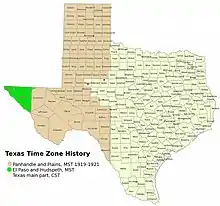 The "Panhandle and Plains" section of Texas is now in the Central Time Zone, but had a two-year period of being in the Mountain Time Zone between 1919 and 1921.[2]