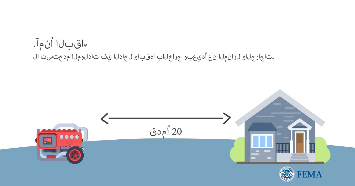 البقاء آمنًا.  لا تستخدم المولدات في الداخل وابقها بالخارج وبعيدًا عن المنازل والجراچات.   20 قدمًا