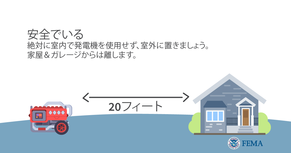 安全でいる 絶対に室内で発電機を使用せず、室外に置きましょう。家屋&ガレージからは離します。 20フィート