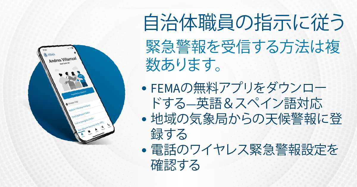 地元公式チャンネルの情報をキャッチするように心がけてください。 緊急警報の受信方法を複数キャッチ出来るようにしてください。 英語とスペイン語で利用できる無料の FEMAアプリをダウンロードしてください。 地元の国立気象局の気象警報に登録してください。 携帯電話のワイヤレス緊急警報設定を確認してください。