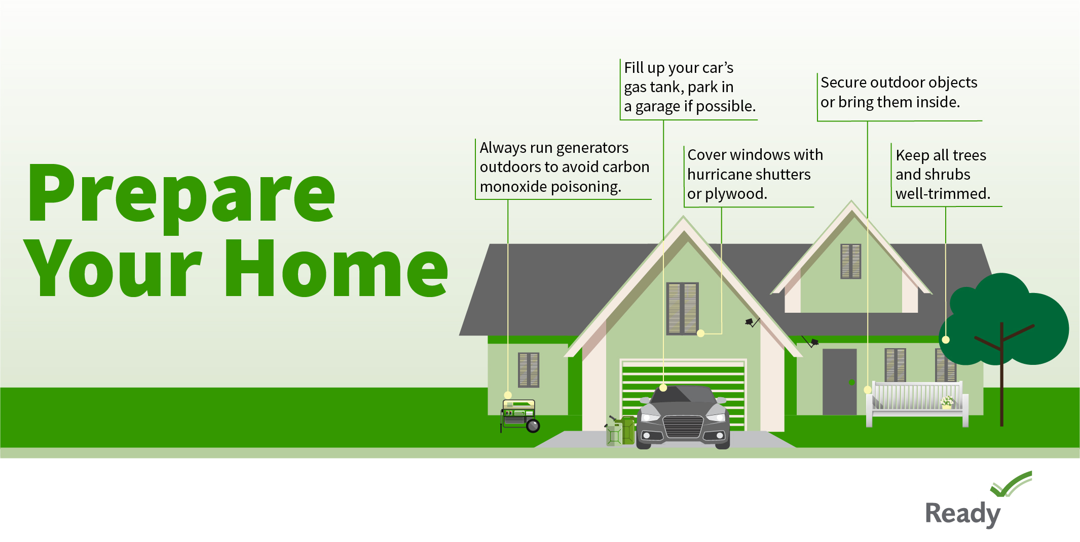 Prepare your home. Always run generators outdoors to avoid carbon monoxide poisoning. Fill up your car's gas tank, park in a garage if possible. Cover windows with hurricane shutters or plywoood Secure outdoor objects or bring them inside. Keep all trees and shurbs well-trimmed.